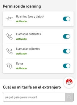 Y puedes desactivarlo para tener un mayor control de roaming siempre que quieras desde la App Mi Vodafone, pulsando desde la página de inicio en "Accesos rápidos" > "Roaming”. En la página que se abre a continuación, puedes gestionar los permisos de roaming de tus líneas para deshabilitar el servicio.